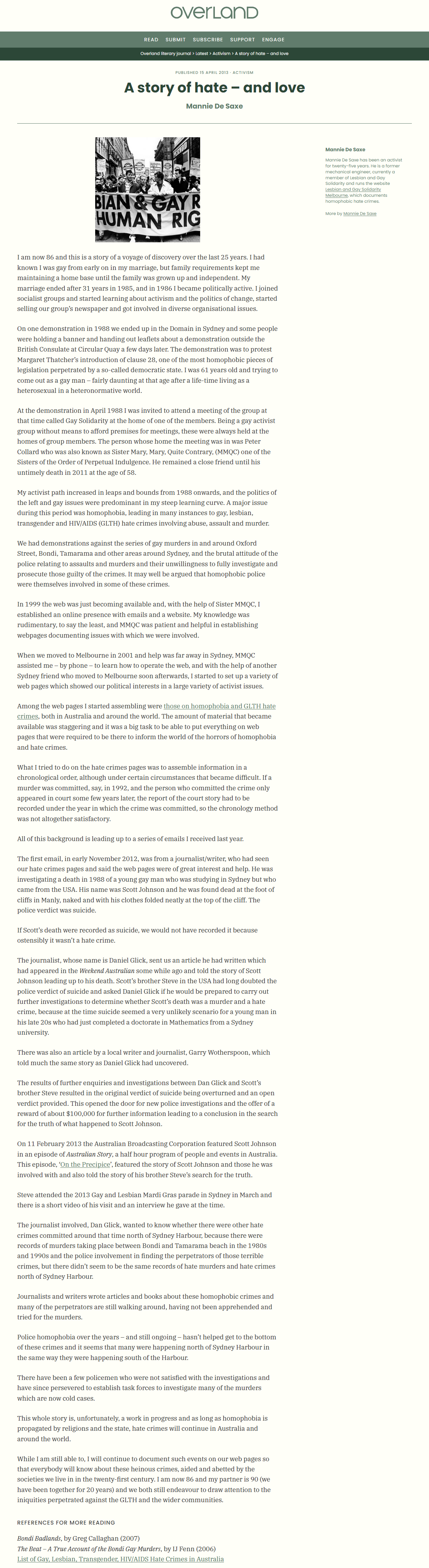 First Mardi Gras Incorporated 15 April 2013 External 2015 Overland: A story of hate – and love, by Mannie De Saxe First Mardi Gras Incorporated 15 April 2013 External 2015